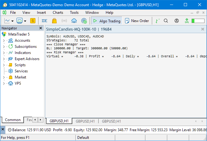 Простой интерфейс позволял отобразить, какие торговые инструменты используются, и каково количество экземпляров торговых стратегий. Если же во входных параметрах итогового советника был включен менеджер закрытия или риск-менеджер, то они тоже выводили свою информацию о текущем состоянии. В целом, окно графика с запущенным советником выглядело примерно так: