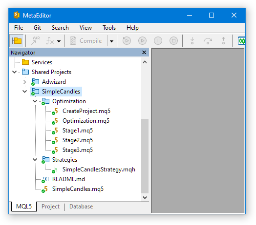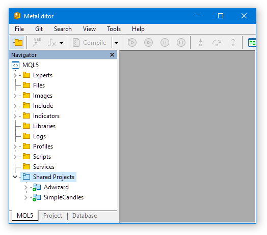 После завершения этого шага у нас есть два репозитория кода: библиотечный (Adwizard) и проектный (SimpleCandles), расположенные в папке Shared Projects рабочей папке MQL5 выделенной копии торгового терминала MetaTrader 5: