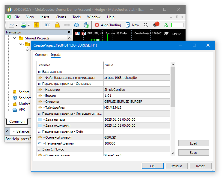 После этого мы можем по очереди запустить на графике терминала (не в тестере!) каждый советник создания проекта оптимизации: