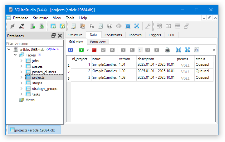 Как видно, в таблице projects у нас появилось три записи для трёх проектов. Имена и версии проектов берутся напрямую из параметров советников создания проектов, а описание проекта сейчас генерируется автоматически по дате начала и окончания интервала оптимизации. При желании, такое поведение можно поменять, но для этого придется вносить правки в библиотечный код.