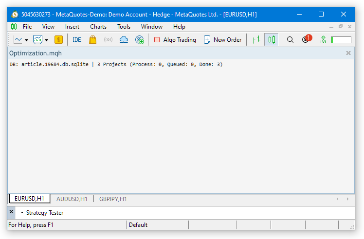 При запуске первого советника создания проекта будет создана база данных оптимизации с именем article.19684.db.sqlite в общей папке данных терминалов. Необходимые задания оптимизации для данного проекта будут в неё добавлены. Поскольку у других советников создания проектов мы указали то же самое имя базы данных, то при их запуске проекты оптимизации создадутся в уже существующей базе данных.