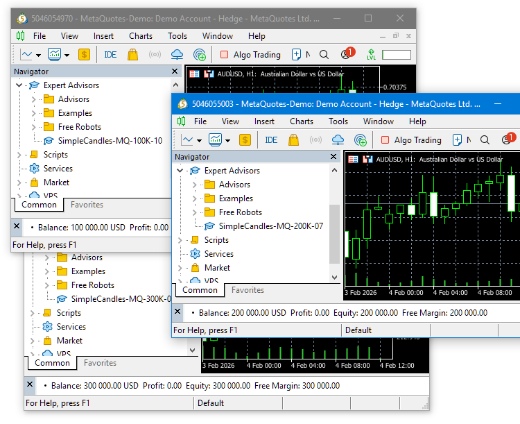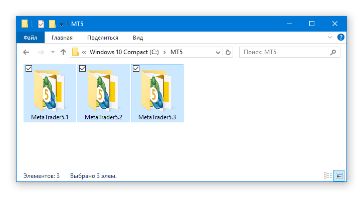 Поскольку эти файлы размещаются в общей папке данных терминалов, то они будут доступны для любого терминала, установленного на данном компьютере. Воспользуемся тремя новыми установками терминала, размещёнными в отдельной папке, например, C:/MT5