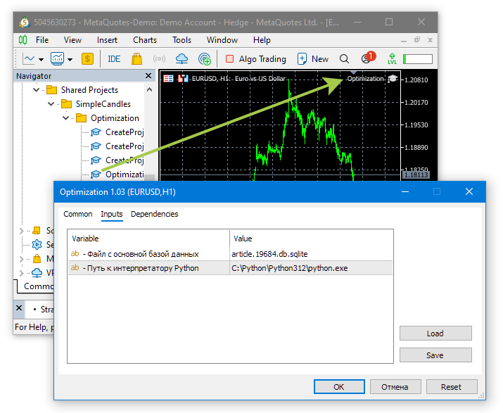 Цель этого шага — скомпилировать и запустить советник автоматической оптимизации проектов. Он располагается в проектном репозитории в файле Optimization/Optimization.mq5. В нём нам достаточно указать только константу с выбранным ранее именем файла базы данных оптимизации: