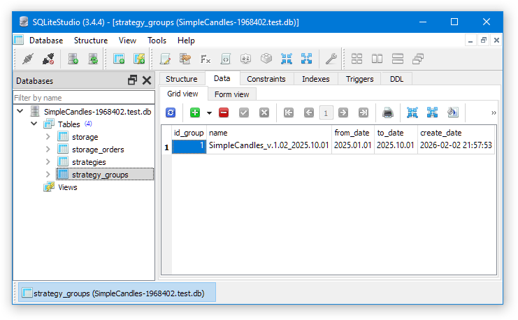 Так как мы запускали конвейер один раз, то в каждой базе данных итогового советника создалась одна группа стратегий с идентификатором 1: