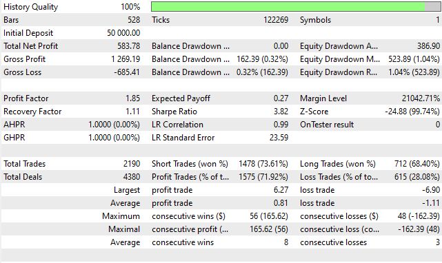 На EURUSD M5 с настройками WindowBars=10, HistoryBars=3000, LotSize=0.01, LotMultiplier=1.5 стратегия за квартал дает количество сделок 300-500, процент прибыльных — 55-65%, среднюю прибыль на сделку — 0.50-1.00 USD, максимальную просадку — 50-100 USD, итоговую прибыль — 150-300 USD на 0.01 лота. Фактор прибыли — 1.3-1.8, коэффициент Шарпа — 0.8-1.2.