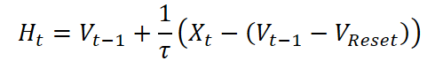 Здесь Vt-1 — это мембранный потенциал на предыдущем шаге, а Xt — входной ток, поступивший в данный момент времени. Функция f(•) определяет характер обновления потенциала и меняется в зависимости от выбранного типа нейрона. Фактически это внутренняя физика нейрона, описывающая, как он реагирует на входящий сигнал.