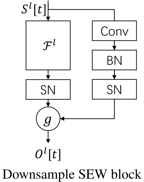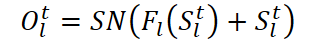 Здесь Sl и Ol — это вход и выход блока на шаге времени t, а SN обозначает срабатывание спайкового нейрона.