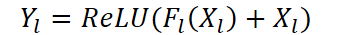 В классическом ResNet такой блок устроен из двух последовательных свёрточных слоёв, нормализации и функции активации ReLU. Если обозначить вход блока как Xl, а выход — как Yl, то в общем виде формула выглядит так: