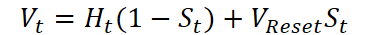 Если спайк произошёл, потенциал возвращается к фиксированному уровню VReset. Это напоминает процесс разрядки батареи: после выброса энергии система должна вернуться в исходное состояние, чтобы подготовиться к следующему сигналу. Если же импульса не было, потенциал сохраняет текущее значение и продолжает накапливаться.
