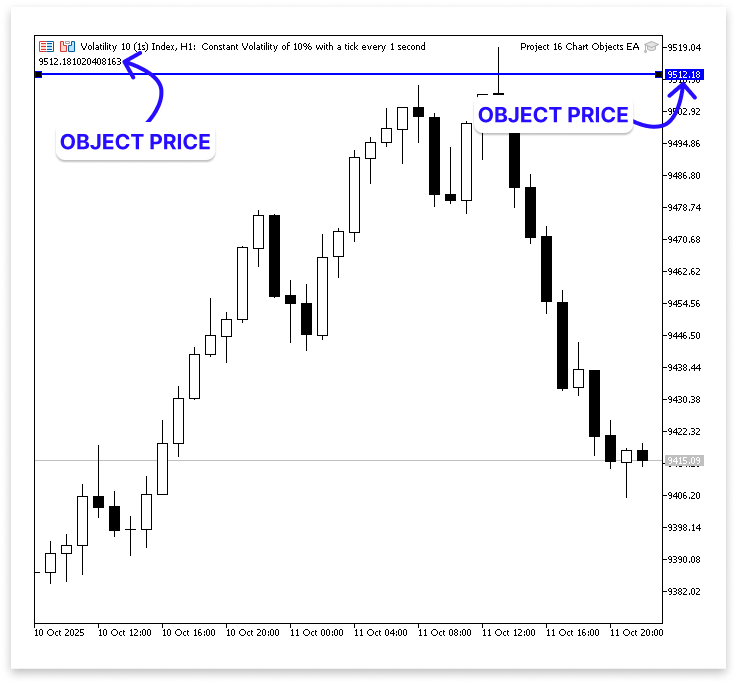 Следующим шагом после того, как вы научились их находить графические объекты, является извлечение данных из них. В языке MQL5 каждый графический объект содержит уникальные данные; однако тип данных, к которому вы можете получить доступ, зависит от типа объекта. Например, поскольку горизонтальная линия охватывает весь график на некотором фиксированном уровне, она содержит только информацию о цене.