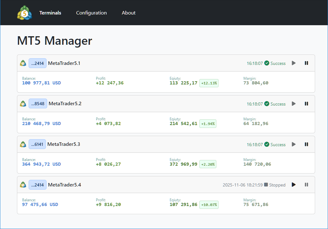 В предыдущей части мы заложили фундамент проекта, создав минимально жизнеспособный веб-сервер, способный управлять запуском и остановкой нескольких экземпляров терминалов MetaTrader 5 через простой веб-интерфейс. Были выбраны FastAPI как основа для серверной логики и Jinja2 для генерации HTML, а работа с процессами реализована через psutil и subprocess. Проект был структурирован: логика управления вынесена в отдельный модуль, добавлены шаблоны и статические файлы, настроены маршруты для запуска, остановки и отображения состояния терминалов. Работоспособность была проверена — через веб-интерфейс нам удалось успешно запускать и останавливать терминалы, расположенные в заданных папках.