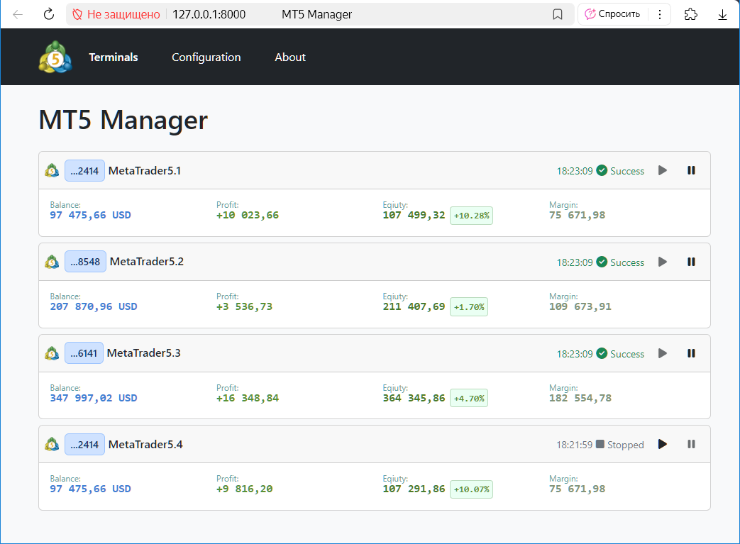 Рис. 1. Главная страница веб-приложения, отображающая информацию о четырёх экземплярах терминала MetaTarder 5