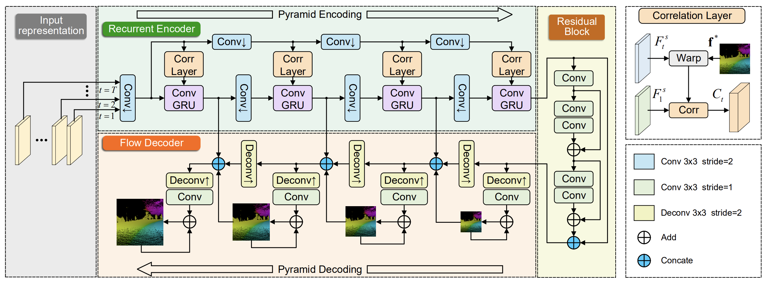 Корреляционный слой вычисляет соответствие между пространственными картами признаков текущего события Fst,t и первого события Fs,1, используя прогнозный поток f* с предыдущей итерации.
