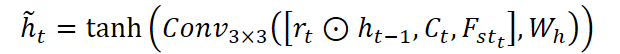 Конкатенация текущих входов с модифицированным состоянием подаётся во второй сверточный блок cHt, который вычисляет кандидатное скрытое состояние.