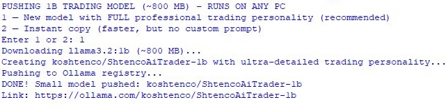 Запуск торговой модели через Ollama сводится к двум скриптам. Первый создаёт и публикует модель с вашей торговой философией.