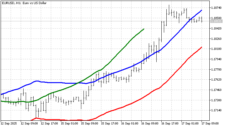 С вероятностью 50% будущее значение SMA будет лежать между красной и синей линиями. Зеленая линия показывает будущее значение SMA на момент расчета прогноза. Индикатор, конечно же ошибается, но ведь и будущее не предопределено.