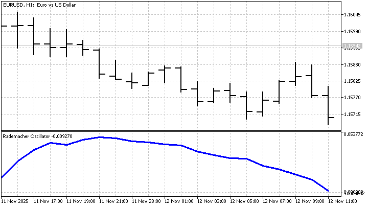 Для построения осциллятора я воспользуюсь способностью этих функций сглаживать тренды. Алгоритм расчета осциллятора будет таким. Сначала я найду значения всех функций Радемахера. После этого я найду разности между текущей ценой и значениями этих функций. Сумма этих разностей и будет текущим значением осциллятора. В результате у меня получится модель изменения тренда.