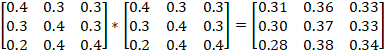 Это переходная матрица цепи Маркова. С помощью этой матрицы я могу прогнозировать будущее состояние рынка. Прогноз на 1 шаг вперед дает сама матрица. А что делать, если я хочу получить прогноз на 2 шага вперед? Для этого мне нужно умножить переходную матрицу на саму себя.