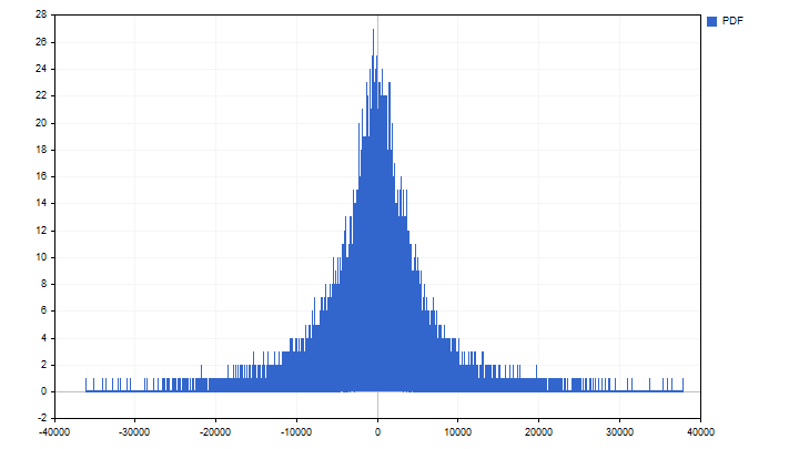 До этого момента мы имели дело с системой функций. И при этом мы не обращали внимания на поведение каждой функции в отдельности. Давайте посмотрим, какие значения может принимать та или иная функция на исторических данных. Для примера я возьму функцию Радемахера 1 порядка. При сборе статистики я не буду нормировать значения функции, а полученные результаты буду переводить в пункты. Так я смогу получить целые числа, а работать с ними очень легко и приятно. Меня интересует, какие значения может принимать функция, и как часто эти значения встречаются в истории. В результате у меня получится эмпирическая функция плотности вероятности (PDF), которая в данном случае выглядит так.