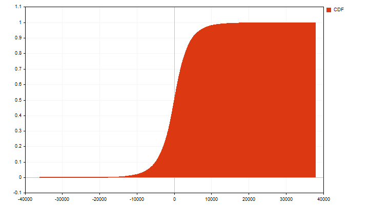 На основе собранной статистики уже можно делать какие-то выводы. Как вы можете видеть, одни значения встречаются чаще, другие реже. И первый вывод, который мы можем сделать — большие тренды встречаются реже, чем маленькие. Также, на основе PDF мы можем построить кумулятивную функцию вероятности (CDF). С математической точки зрения CDF представляет собой сумму вероятностей текущего значения со всеми значениями меньше текущего. Как правило, она принимает вид S-образной кривой, растущей от 0 до 1.