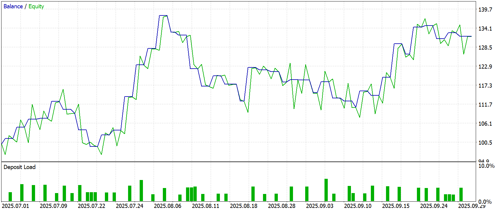 Во время тестирования модель показала рост капитала со 100.0USD до 133.36USD — устойчивый прирост на 33.36%. Баланс и эквити демонстрируют плавный рост с контролируемыми просадками, без резких падений. Максимальная просадка составила 29.83USD (25.36%), но модель быстро восстанавливалась, демонстрируя способность адаптироваться к рыночным колебаниям.