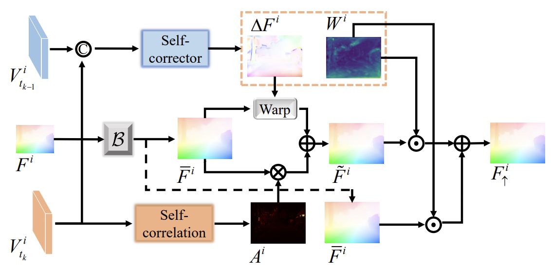 Следует подчеркнуть принципиальное отличие нашей реализации от авторской версии фреймворка. В оригинале Self-Correlation основана на механизме Self-Attention, который ищет в пространстве признаков области, идентичные движению в проблемной зоне исходного потока. Другими словами, внимание применяется к сырому потоку до корректировки, и модель пытается восстановить детали на основе исходных, ещё не уточнённых данных.