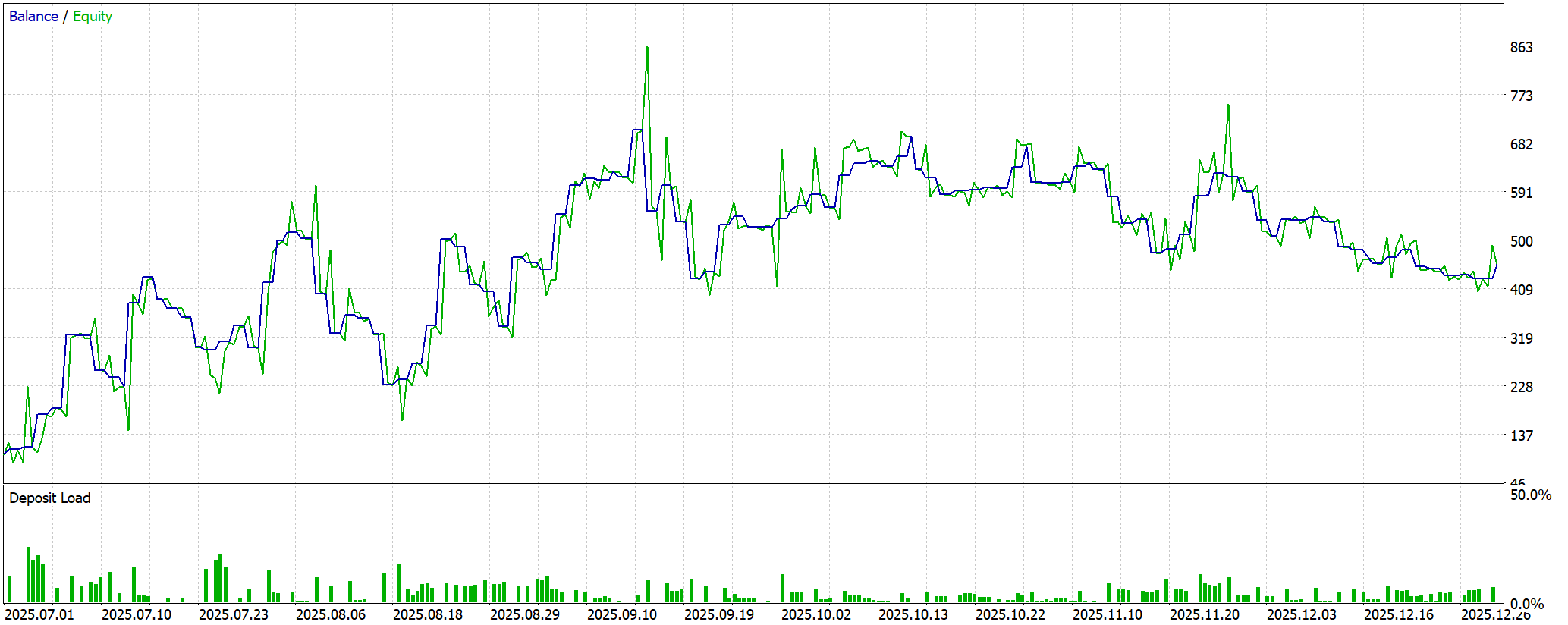 Одновременно тест выявил серьёзные риски. Максимальная просадка баланса достигла $285.85 (55.46%), а плавающая просадка Equity — 72.69%, что указывает на агрессивную стратегию удержания позиций и высокую волатильность капитала. Recovery Factor равен 0.76, демонстрируя, что восстановление после экстремальных просадок происходит недостаточно быстро.