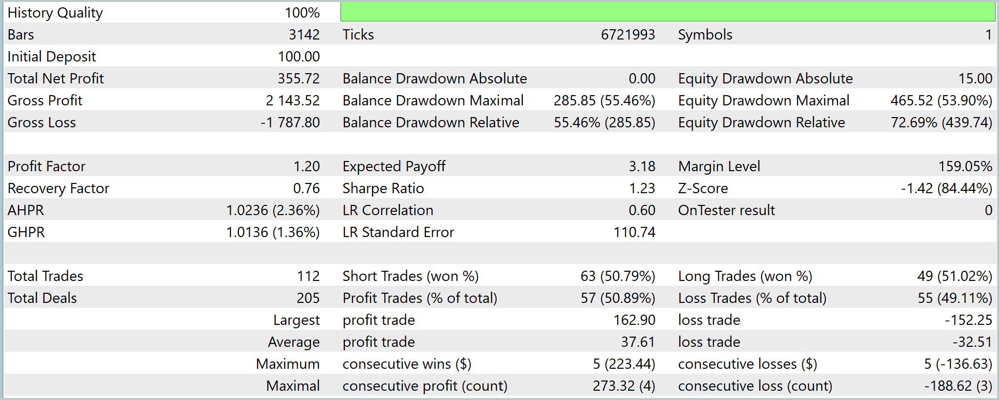 Тестирование показало впечатляющую динамику, одновременно демонстрируя сильные и слабые стороны модели в условиях реального рынка. В течение периода тестирования модель обработала более 6.7 миллионов тиков и 3.1 тысячи баров, начиная с начального депозита $100. Финансовый результат оказался заметным. Чистая прибыль составила $355.72, что увеличило баланс почти в 4.5 раза и обеспечило относительную доходность 356%. Валовая прибыль была $2143.52 при валовом убытке $1787.80, что дало Profit Factor на уровне 1.20. Такой показатель подтверждает положительное математическое ожидание системы, хотя запас устойчивости остаётся умеренным.
