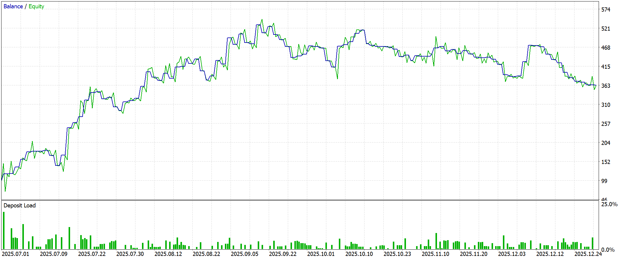 По результатам тестирования доходность составила 263%. При этом просадки оказались заметными — до 52% по Equity. Это отражает активный характер анализа микрособытий и подчёркивает, что модель реагирует на рынок чувствительно.