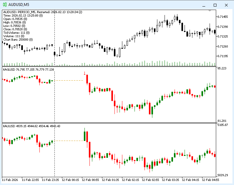 Результат работы индикатора приведен на рис.2. Здесь наряду с основным графиком символа AUDUSD отображаются графики XAGUSD и XAUUSD. Это характерный пример для проверки синхронизации, поскольку у инструментов XAGUSD и XAUUSD отсутствуют данные с нуля часов до часа ночи.