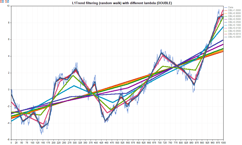Скрипт показывает фильтрацию тренда L1 для различных значений параметра регуляризации λ (заданных в единицах λmax как lambda_factors = {1.0,0.8,0.5,0.2,0.1,0.01,0.001});