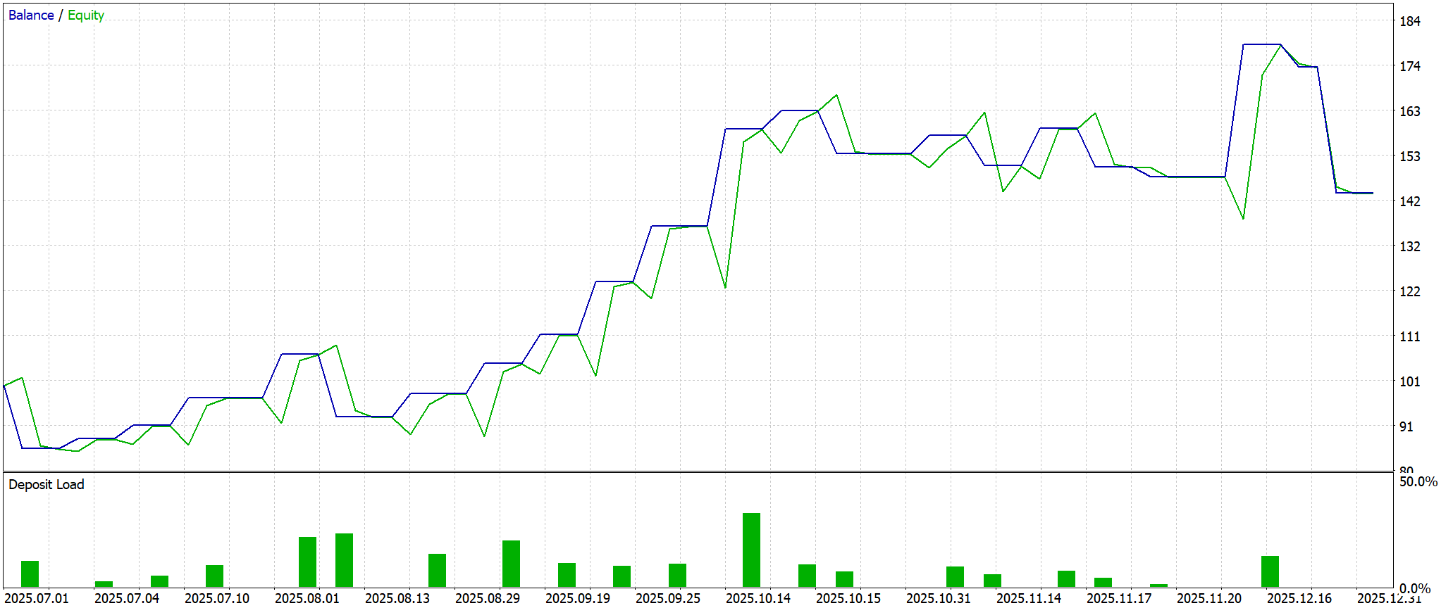 Кривая капитала в целом имеет выраженный восходящий характер, но развивается ступенчато. Долгие периоды ожидания сменяются короткими фазами активной работы, после которых баланс фиксирует новый уровень. Такая форма характерна для систем, ориентированных на события и импульсы, а не на постоянное присутствие в рынке. Линия Equity при этом заметно колеблется вокруг баланса, что говорит о наличии плавающих просадок. Однако эти колебания остаются контролируемыми и не переходят в разрушительные провалы. Важный момент — после резких подъёмов практически всегда следует откат и фиксация прибыли. Это признак рабочей логики выхода, а не агрессивного удержания позиций в надежде на продолжение движения.