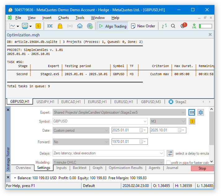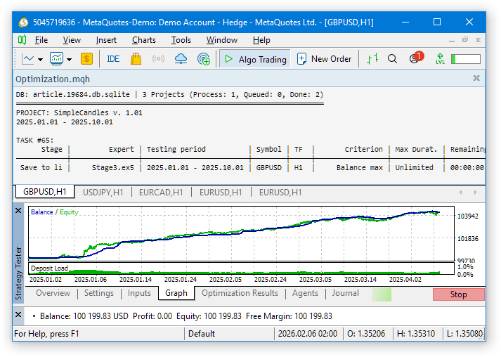 Поменяем статус у третьего этапа первого проекта в таблице stages так же, как мы чуть ранее сделали это со статусом второго этапа. Если мы не удалили с графика терминала советник автоматической оптимизации, то он сразу приступит к выполнению поставленной задачи. Если успели его удалить, то понадобится снова его прикрепить к графику. При этом советник сам найдет задачу, поставленную в очередь, и начнёт её выполнять: