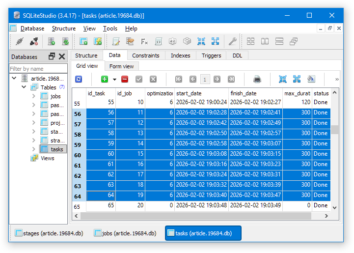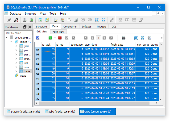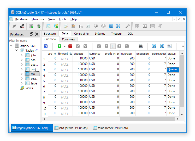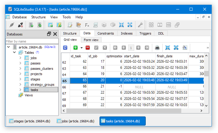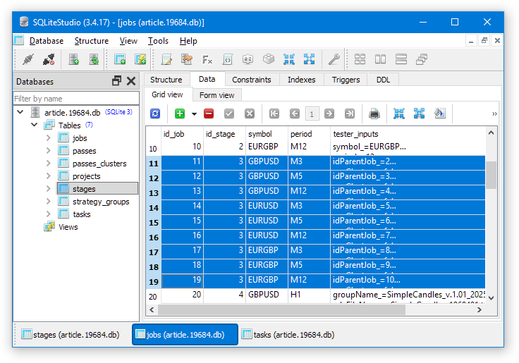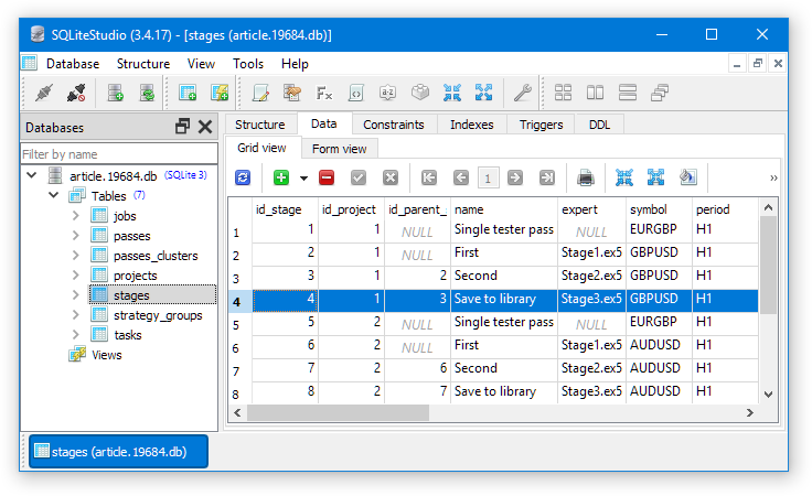 Откроем базу данных оптимизации article.19684.db.sqlite в SQLiteStudio. Создание базы данных итогового советника должно было выполниться на третьем этапе. Поэтому нам нужно найти запись в таблице задач (tasks), которая соответствует работе (job), выполняемой на третьем этапе (stage). Открываем содержимое таблицы этапов (stages) и находим в ней запись для первого проекта (id_project = 1) с третьим этапом (expert = Stage3.ex5 или name = "Save to library"):