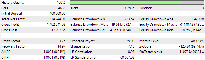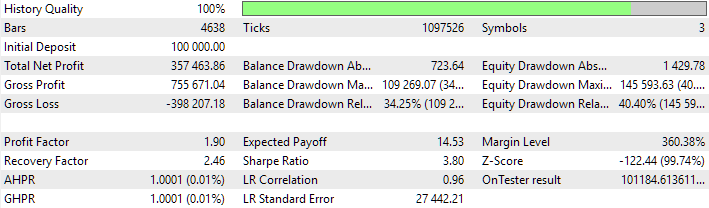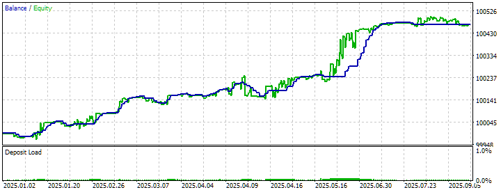 Как видно, просадка составила более 40% вместо ожидаемых 10%. Это влияние менеджера закрытия и риск-менеджера. Риск-менеджер закрыл все позиции 2025.04.09, так как была достигнута прибыль 200% от начального баланса $100000. Данный момент времени начала торговли оказался неудачным, что привело к нескольким срабатываниям риск-менеджера, закрывшим позиции по достижении просадки более 20% до начала следующего дня. Такое поведение будет предметом дальнейших исследований, так как ранее мы использовали риск-менеджер в ситуациях, когда рост депозита составлял единицы процентов, а не сотни. Возможно, что потребуется вносить корректировки в его работу.