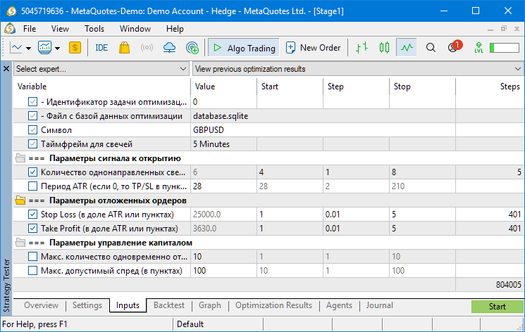 Сделав такой выбор начальных диапазонов входных параметров стратегии для оптимизации, приступим к проверке, насколько этот выбор является приемлемым.