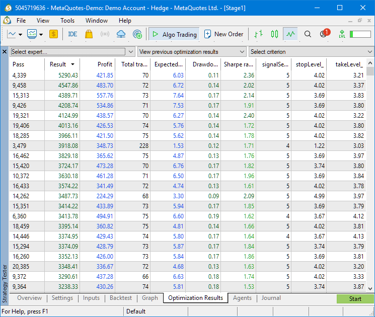 На этом этапе оптимизация уже не выполняется, а запускается одиночный проход советника третьего этапа Stage3.ex5. В результате у нас появится база данных итогового советника для первого проекта: