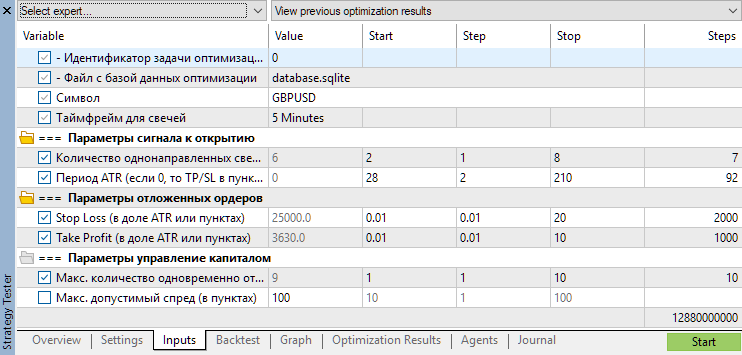 - takeLevel_ — Take Profit (в доле ATR или пунктах). Аналогично предыдущему параметру, возьмем широкий диапазон значений с маленьким шагом. Например, от 0.01 до 10 с шагом 0.01. Максимальное значение взяли поменьше, чтобы в среднем в комбинациях параметров чаще встречался TP, который меньше SL, но и обратная ситуация тоже могла встретиться.