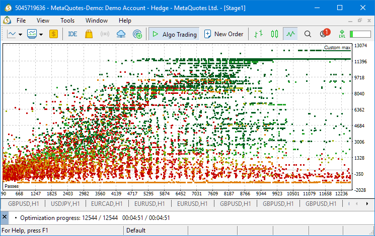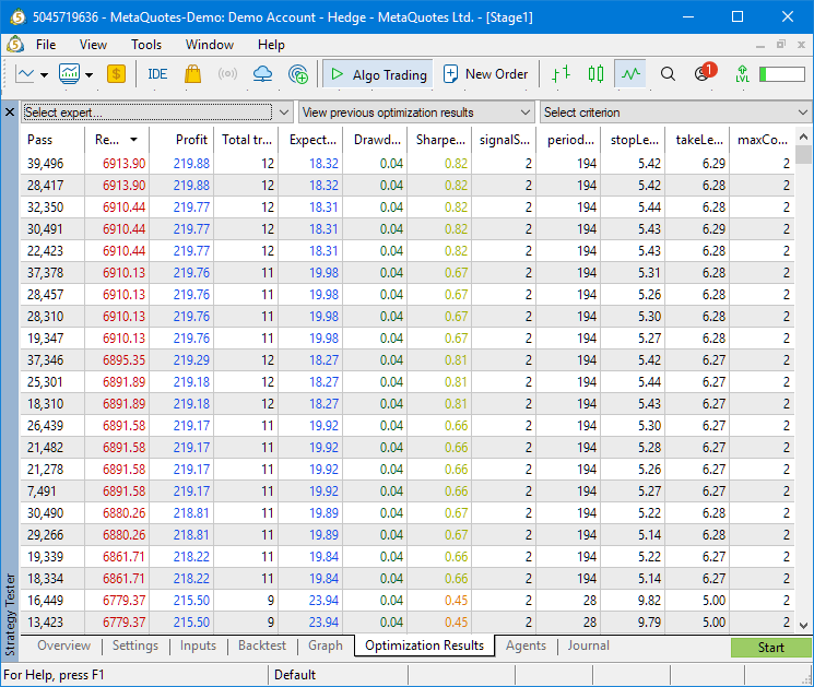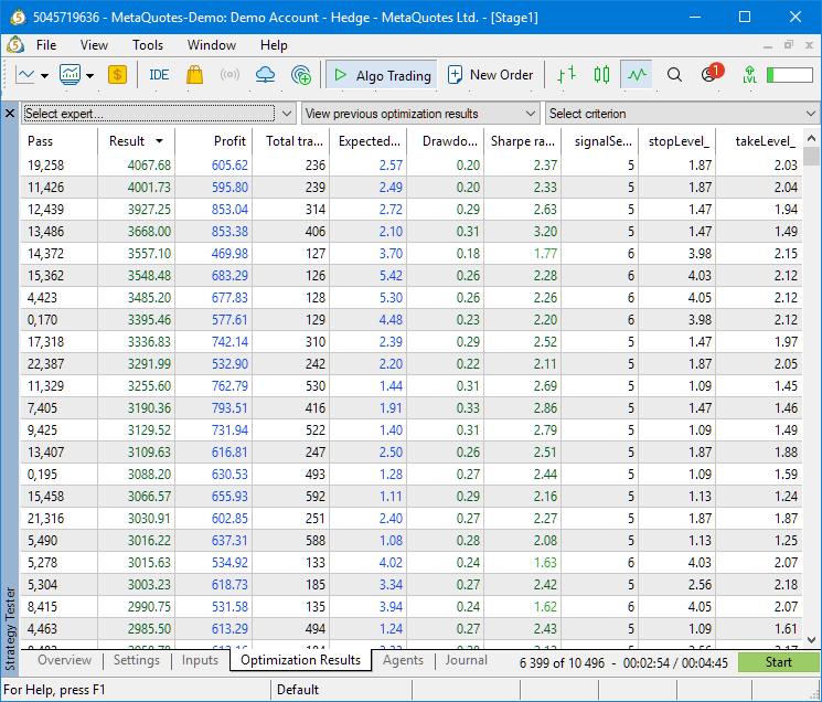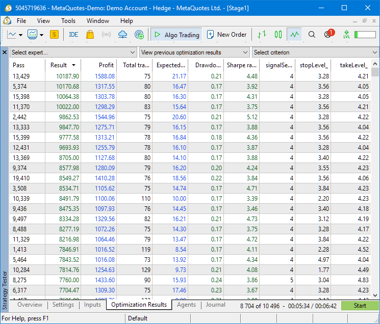 В начале развития проекта мы использовали разные критерии в пределах одной работы. Это повышало разнообразие получаемых комбинаций параметров, подбираемых в разных процессах оптимизации. Но после разработки критерия нормированной среднегодовой прибыли, постепенно перешли к использованию только этого критерия. С ним тоже получается достаточное разнообразие.Значение Критерий 0 Balance max 1 Profit Factor max 2 Expected Payoff max 3 Drawdown min 4 Recover Factor max 5 Sharpe Ratio max 6 Custom max 7 Complex Criterion max - stage1MaxDuration_ — максимальная продолжительность задач в секундах. При пробных запусках на имеющихся мощностях агентов тестирования мы получаем возможность оценить время, затрачиваемое на один процесс оптимизации (или задачу оптимизации). Наблюдая за процессом вживую, можно заметить, что достаточно хорошие результаты встречаются и гораздо раньше, чем тестер решит завершить оптимизацию. Поэтому мы можем сократить общее время первого этапа автоматической оптимизации, если ограничим время выполнения одной задачи. Сделать это можно, указав в этом параметре число, большее 0. Если будет указан 0, то это означает отсутствие ограничения по времени.