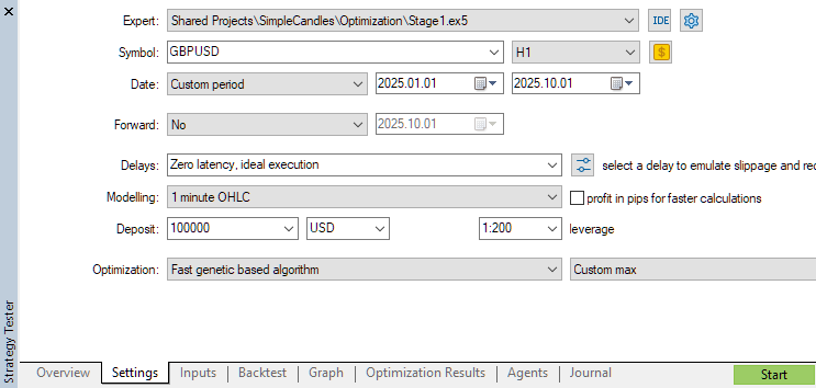 Откроем тестер стратегий, выберем в нём генетическую оптимизацию советника первого этапа на временном интервале от 2025.01.01 до 2025.10.01 (9 месяцев) и внесём в параметры выбранные выше значения: