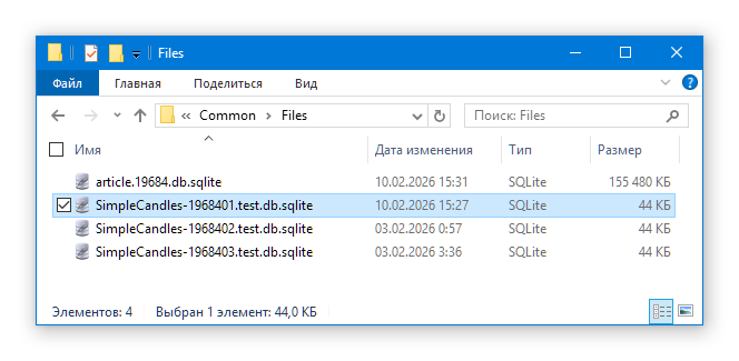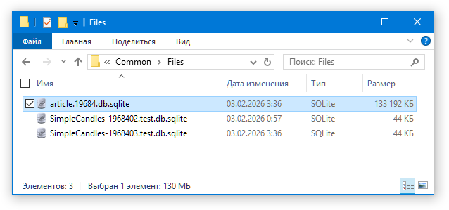 - Переименовать или скопировать базу данных итогового советника в файл с именем <имя_советника_без_расширения>-<магический_номер>.sqlite, то есть SimpleCandles-MQ-100K-10-1968401.db.sqlite