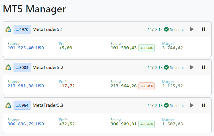 Для дальнейшего наблюдения за несколькими терминалами с запущенными итоговыми советниками можно использовать веб-интерфейс проекта MT5 Manager, доступный в хранилище MQL5 Algo Forge. На данном этапе мы сможем увидеть примерно такую картину для трёх запущенных терминалов: