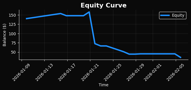 Дополнительным фактором выступает использование жёстко заданного горизонта прогнозирования и бинарной классификации UP/DOWN. Такой подход игнорирует распределение внутрипериодной волатильности и последовательность ценовых экстремумов внутри прогнозного окна. В реальной торговле порядок достижения локальных максимумов и минимумов критичен: модель может корректно предсказать итоговое направление через 24 часа, но при этом цена может пройти стоп-лосс задолго до достижения целевой точки. Бэктест наглядно показывает, что именно этот эффект является доминирующим источником убытков.