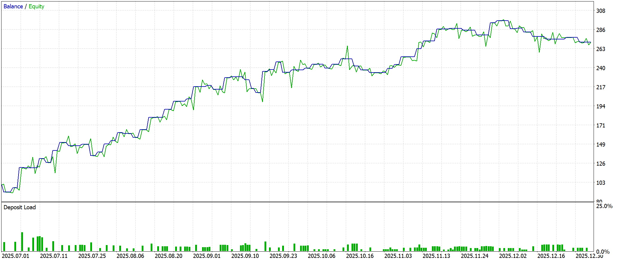 Результаты тестирования показывают, что реализованная модель Lattice формирует системный, статистически устойчивый торговый инструмент с умеренным риском и высоким качеством исполнения. За период тестирования модель совершила 63 сделки. Начальный депозит в 100USD вырос до итогового капитала 270,55USD, обеспечив прирост 170,55%.