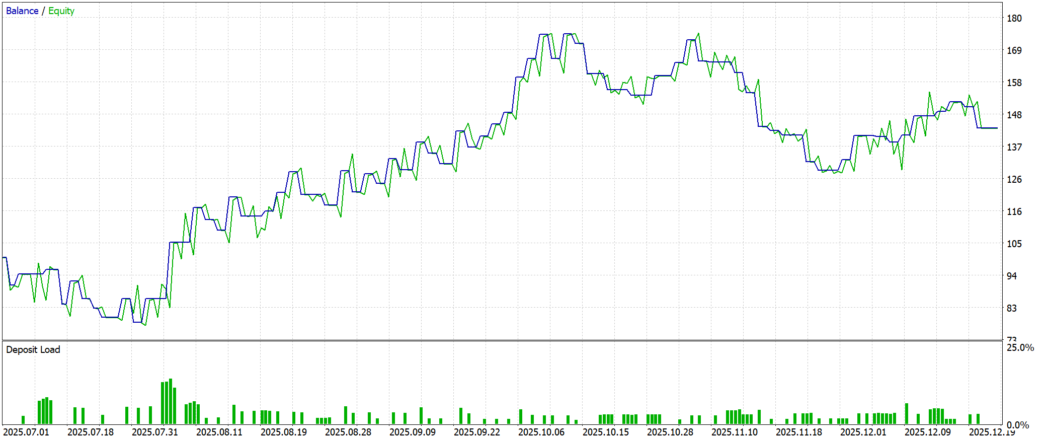Риск-профиль остаётся умеренным. Максимальная просадка составила около 27%. Для депозита 100 USD это чувствительно, но важно понимать масштаб. При большем капитале относительные показатели сохраняются, меняется лишь абсолютная величина. При этом нагрузка на депозит не превышала 25%, а уровень маржи оставался комфортным. Система не работала на пределе возможностей счёта, сохраняя запас прочности.