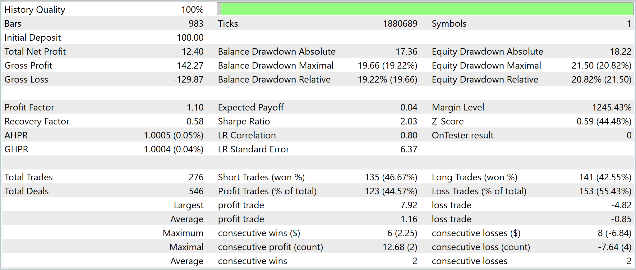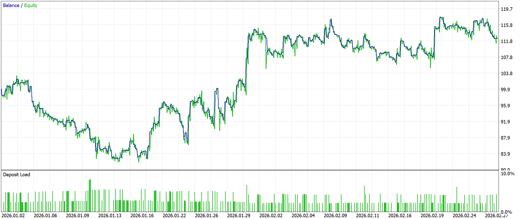 Результаты тестирования демонстрируют умеренно положительный финансовый результат при контролируемом уровне риска. Начальный депозит в 100 USD вырос до 112.40 USD, что соответствует 12.4% прироста капитала. Profit Factor равен 1.10, что указывает на минимальное стабильное статистическое преимущество. Максимальная просадка по балансу достигла 19.66 USD (≈19%), а по средствам — 21.50 USD (≈21%). Это формирует умеренно агрессивный риск-профиль.