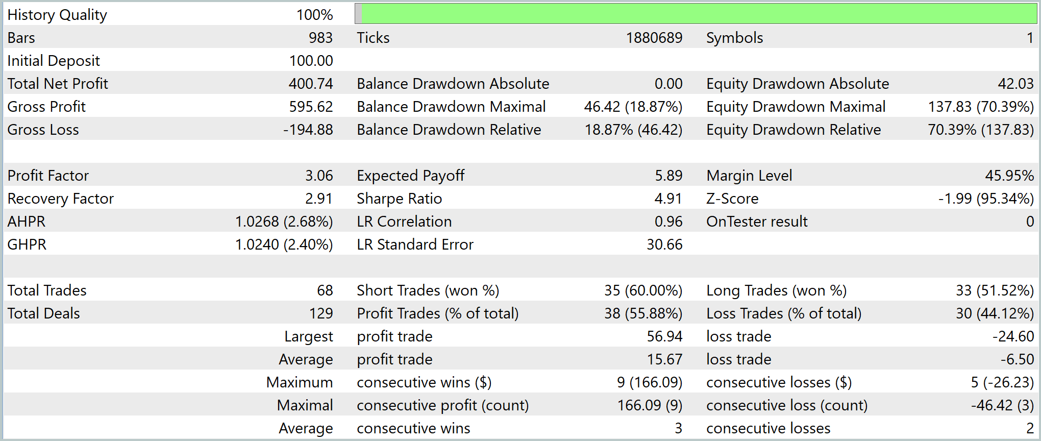 Показатели стратегии высокие. Profit Factor 3,06, средняя прибыль на сделку 5,89 USD, отношение прибыль/убыток 2,41. Сделки стабильны: 68 операций, выигрыши 55,9%. При этом short-позиции работают лучше long. Максимальная серия выигрышей 9, проигрышей 5, что подтверждает системность сигналов.