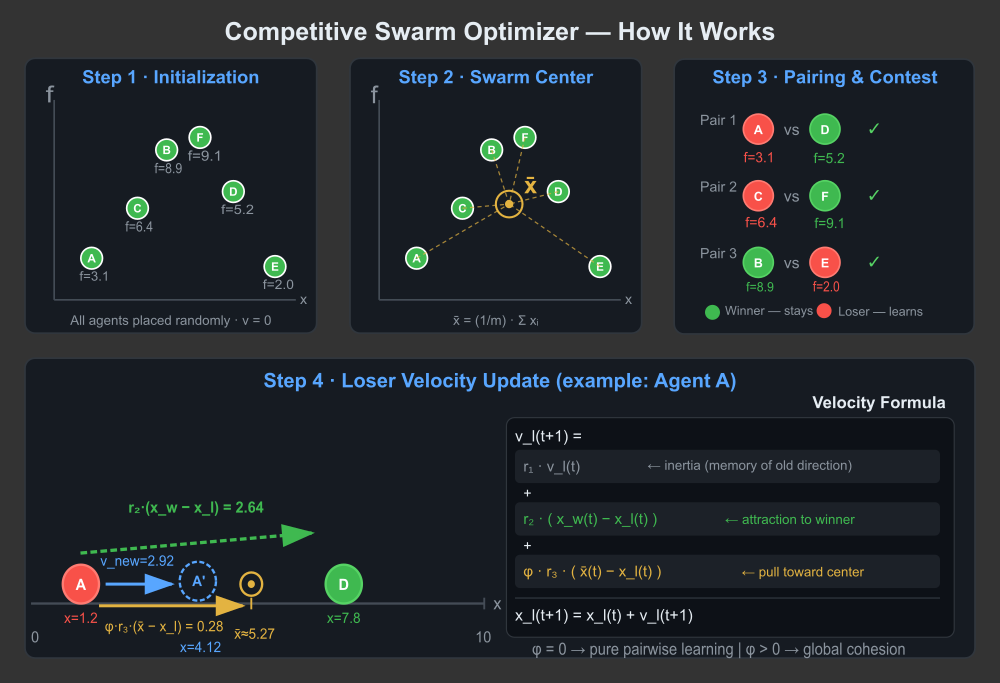 Именно такой механизм предлагает Competitive Swarm Optimizer (CSO), представленный в 2014 году Ран Чэном и Яочу Цзинем. В каждом эпохе агенты случайно разбиваются на пары, проигравший учится у победителя и мягко притягивается к центру роя — единственному глобальному ориентиру, — а победитель не трогается вовсе. Информация о хороших решениях распространяется не напрямую, а через цепочку встреч.