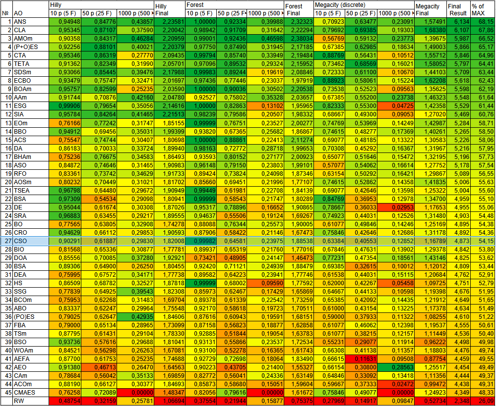 | 10 | AAm | archery algorithm M | 0,91744 | 0,70876 | 0,42160 | 2,04780 | 0,92527 | 0,75802 | 0,35328 | 2,03657 | 0,67385 | 0,55200 | 0,23738 | 1,46323 | 5,548 | 61,64 |