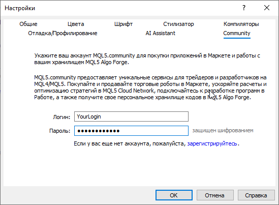 Убедитесь, что в настройках редактора во вкладке Community указан логин и пароль от вашего аккаунта на mql5.com:
